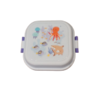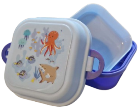 Boîte à goûter. Sur le couvercle, on voit la pieuvre, les méduses, le requin et les petits poissons.Le couvercle a une fermeture à clips.La boîte comprend 2 compartiments pour séparer les aliments.