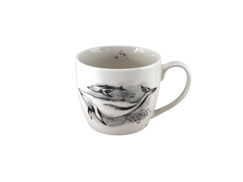 Déjeuner baleine. Cette grosse tasse avec une anse est en porcelaine. Une baleine nage , elle a son bébé sur le dos. Idéal pour le déjéuner – 400 ml -Parfait pour tous les amoureux du plus gros mammifère marin.