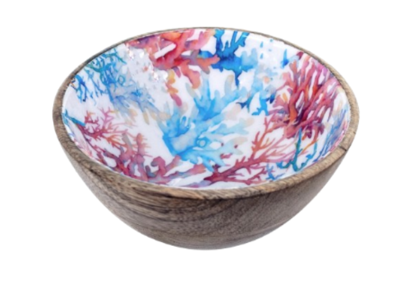 Un petit saladier en bois de manguier. Le décor à l’intérieur est lumineux avec ses morceaux de corail entrelacés. Il est destiné à un usage alimentaires mais ne va pas au lave vaisselle. Le bois de manguier est un bois avec de jolies teintes et de jolies veinures