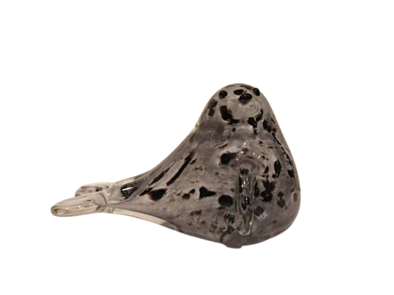 Phoque en verre. Il moucheté dans un dégradé de gris et quelques touches noires. Il a une posture élégante, comme posé sur un banc de sable. Les nageoires à l’avant et le bout de la queue sont transparents