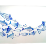 Planche à découper poisson. Une multitude de poissons dans un joli dégradé de bleus traversent la planche…comme des sardines qui se déplacent en banc. La planche à découper est en verre trempé, très solide. Elle repose sur 4 petits supports souples qui lui évite de glisser