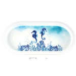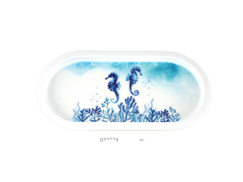 Plateau oval hippocampe. Il est assez épais avec un rebord blanc. Les deux hippocampes nagent au dessus d’algues et de corail, le tout dans un joli dégradé bleu clair et bleu plus foncé.
